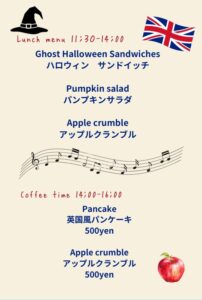 英国にまつわるランチ(11:30~)と今月のテーマから1冊の本の話(12:30~)とピアノ演奏(12:50頃~)